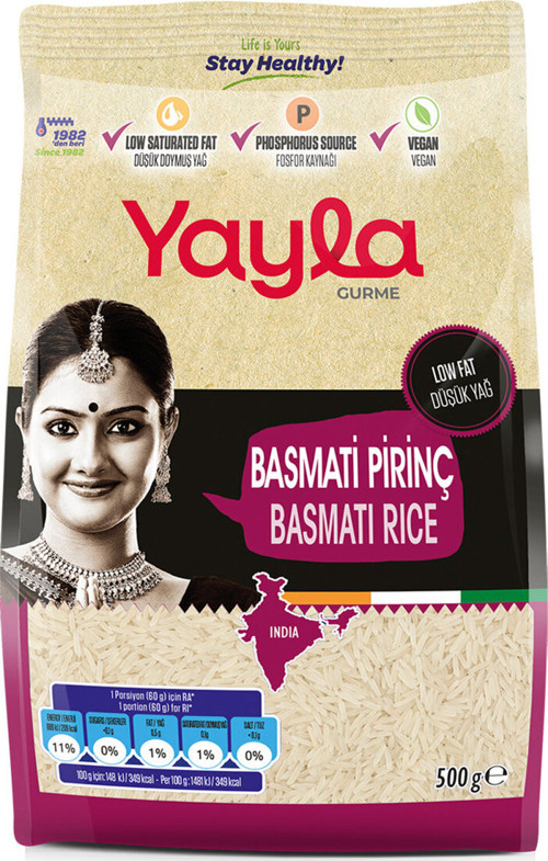 - YAYLA GURME Basmati pirinç, Hindistan'ın verimli topraklarından özenle seçilmiş, 500 gramlık paketlerde sunulmaktadır.