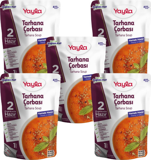 İçindekiler: Tarhana (%6), (Buğday unu, yoğurt, domates, nohut, kırmızı mercimek, dereotu, fesleğen, yeşil biber, havuç), su, bitkisel yağ (ayçiçek yağı), domates salçası (%2), tuz, sarımsak, soğan, karabiber, toz kırmızı biber, nane.