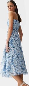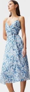 Bu nefes kesici midi elbise, yaz aylarında hem şık hem de rahat olmak isteyenler için mükemmel bir seçim. Canlı mavi tonlarındaki soyut desenleri ve şifon kumaşıyla göz kamaştırıcı bir stile sahip bu elbise, gün boyu konfor sunuyor. A-line kesimiyle vücudunuza mükemmel uyum sağlayan elbise, zarif V yakasıyla da feminen bir görünüm yaratıyor. İç astarı sayesinde transparan görünümden uzak dururken, rahatlığı da ön planda tutuyor. Belinizde bulunan kuşak detayı ile görünümünüzü daha da güzelleştirebilirsiniz.