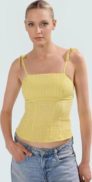 Bluzun sarı ve beyaz ekose deseni, yaz aylarına canlılık katarken, ince askılarıyla da rahat bir kullanım sağlar. Gofre dokuma kumaşının yumuşak dokusu, teninizde hoş bir his bırakırken, %1 elastan oranı sayesinde hareket özgürlüğünüzü kısıtlamaz. Bluzun regular boyu, her kıyafetinizle uyumlu bir görünüm oluşturmanızı sağlar. Bu şık ve rahat bluzu, günlük aktivitelerinizde, arkadaşlarınızla buluşmalarda veya tatilde dilediğiniz gibi kullanabilirsiniz.