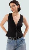 Bu kolsuz siyah bluz, yaz aylarında hem şık hem de rahat bir görünüm elde etmek isteyen kadınlar için mükemmel bir tercih. Likralı süprem kumaştan üretilen bluz, esnek yapısıyla vücuda mükemmel uyum sağlar ve gün boyu konfor sunar. Fitted kalıbı, vücut hatlarınızı zarifçe ortaya koyarken, çift taraflı fermuar detayı bluza modern ve dikkat çekici bir hava katıyor. Bu bluz ile jeanleriniz, şortlarınız ya da eteklerinizle stil sahibi kombinler oluşturabilirsiniz.