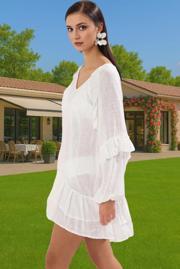 Pamuklu viskoz karışımı, nefes alabilen yapısıyla sizi gün boyu serin ve rahat tutar. Cilde dost dokusu, yumuşaklığı ve konforu bir araya getirirken, volan detayları ise elbiseye hareketlilik ve şıklık katıyor. Shift kalıbı her vücut tipine uyum sağlayarak, kusursuz bir görünüm sunar. Elbisenin uzun kolu ise güneşten korunmanızda ekstra bir avantaj sağlar. Düz deseni ise her türlü plaj aksesuarı ile kolayca kombinlenmenize olanak tanır. Makinede yıkanabilir özelliği ise kullanım kolaylığı sunar.
