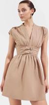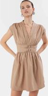 Sizi yaz sıcağında serin ve şık tutacak bu mini elbise, rahatlığı ve stili bir araya getiriyor.Pamuklu gabardin kumaştan üretilen elbise, nefes alabilir yapısıyla gün boyu konfor sunuyor. A kesim tasarımı ve bel kısmındaki kemer detayı ile vücut hatlarınızı zarifçe ortaya koyarken, mini boyu ile modern bir görünüm sağlıyor. V yakası ve kolsuz tasarımı sayesinde hem rahat hem de şık bir görünüm elde edebilirsiniz. Bu elbiseyle yaz günlerinizin tadını çıkarın!