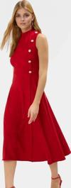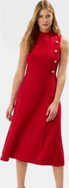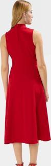 Yüksek kaliteli polyester ve elastan karışımı kumaş, hem şıklığı hem de konforu bir arada sunar. Elbisenin belden açılan eteği ve vücut hatlarınızı saran kesimiyle, her zaman dikkat çekici görünmenizi sağlar. Kolsuz tasarımı sıcak yaz günlerinde serin kalmanızı sağlarken, dik yakasıyla şık bir görünüm sunar. Bu zarif midi elbise, iş hayatından sosyal yaşamınıza kadar her yerde mükemmel bir seçenek.