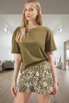 Yaz aylarının sıcak gecelerinde, kendinizi serin ve konforlu hissetmenizi sağlayacak bir pijama takımı arıyorsanız, doğru yerdesiniz! Haki Çiçek Desenli Pamuklu Pijama Takımı, %100 pamuk kumaşıyla nefes alabilirliği ve yumuşaklığı bir araya getiriyor. Çiçek deseninin şıklığı ile rahatlığın mükemmel uyumu, size huzurlu bir uyku vadediyor.