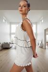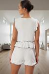 Yaz sıcağında bile rahatlığınızı koruyun! %100 pamuklu, nefes alan yapısıyla tasarlanan bu iki parçalı pijama takımı, gün boyu süren konforu garanti eder. Fırfırlı detaylarla süslenmiş şık tasarımı, evde geçirdiğiniz zamanları daha keyifli hale getirecek. Regular kalıp, her vücut tipine mükemmel uyum sağlar. Bisiklet yakalı üst ve boru paça şort alt, rahat ve şık bir kombin oluşturur. Crinkle dokuma tipi, takıma eşsiz bir doku ve görünüm kazandırıyor.