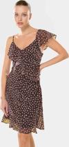 Yaz aylarının vazgeçilmez parçası olacak bu şık mini elbise, özgür ruhlu ve modern kadınlar için tasarlandı. Kahverengi puantiyeli deseni ve A kesim modeliyle her ortamda göz alıcı bir görünüm sunuyor. Hafif ve nefes alan şifon dokuma kumaştan üretilen elbise, gün boyu konfor ve serinlik hissi sağlıyor. Volanlı ve fırfırlı detaylarıyla feminen bir şıklık sunarken, kolsuz tasarımıyla sıcak havalarda rahat hareket etmenizi sağlıyor. Astarlı yapısıyla da ekstra konfor sağlıyor. A kesiminin rahatlığı ve şıklığını birleştiren bu elbiseyi günlük aktivitelerinizde, arkadaşlarınızla buluşmalarda, akşam davetlerinde ya da yaz partilerinde gönül rahatlığıyla tercih edebilirsiniz. Rahat ve modern tarzınızı yansıtan bu elbiseyi farklı aksesuarlarla kombinleyerek tarzınızı kişiselleştirebilirsiniz.