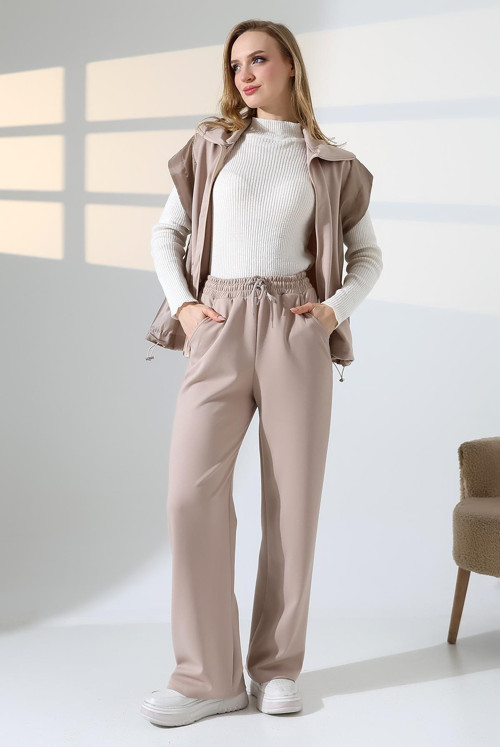 Bej Yumuşak Dokulu Dik Yaka Oversize Lastikli Kadın Eşofman Takım - 95349 - Image 1