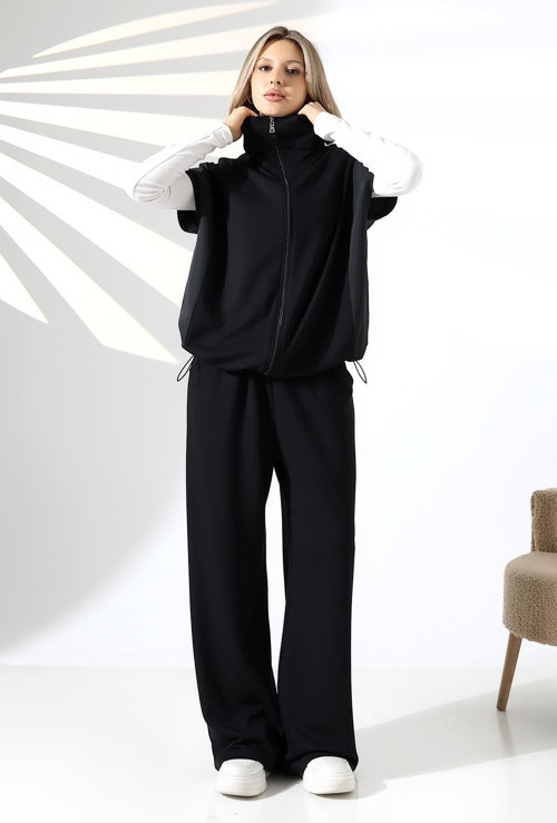 Dik yaka tasarımı sayesinde modern ve bir görünüm kazandırırken, bel lastiği sayesinde konforlu bir oturuş sağlar.