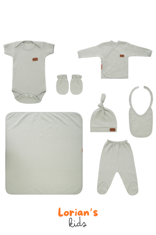 Lorian's Yeni doğan Petek Dokulu 7'li Battaniyeli Zıbın Takımı %100 Pamuklu Hastane Çıkışı- Su Yeşili