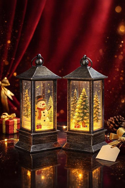 Kesene Yeni Yıl Noel Temalı 2 Li Set Işıklı Yılbaşı Feneri Kardan Adam Çam Ağacı Figürlü Fener Gri Set 14cm
