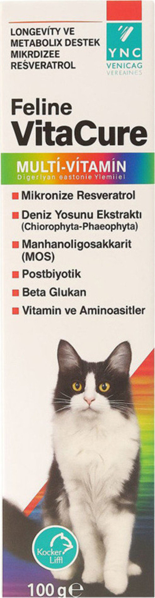 Ync Feline Vitacure; kedilerin genel sağlığını desteklemek için günlük kullanıma uygun olarak formülize edilmiş esasinyel aminoasit ve vitaminlerle zenginleştirilmiş antioksidan kaynağı olarak resveratol, DHA kaynağı olarak deniz yosun ektratı, prebiyotik ve postbiyotik içren bir üründür.