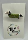 Puantiyeli yeşil kazağıyla kış enerjisini yansıtan bu köpek figürü, el yapımı detaylarıyla dikkat çeker.