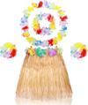 Bu 5 parçalı Hawaii kostüm seti, doğadan ilham alan naturel renkli eteği ve rengarenk çiçek aksesuarlarıyla tropikal bir atmosfer oluşturur. Set içinde 40 cm uzunluğunda püsküllü etek, renkli çiçeklerden yapılmış bir kolye, bir taç ve iki bileklik bulunmaktadır.