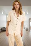 Evde rahatlık ve dışarıda şıklık arayanlar için ideal bir seçim olan bu Ekru yıldız desenli pijama takımı, yumuşak dokusu ve rahat kalıbıyla dikkat çekiyor. 95% Polyester ve 5% Elastan karışımından üretilen, süprem örme kumaş, gün boyu konfor sunuyor. Kısa kollu gömlek yakalı üst ve boru paçalı alt parçadan oluşan takım, mükemmel bir uyum sağlıyor. Regular kalıbı, her vücut tipine uyum gösteriyor.