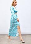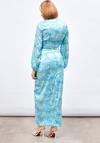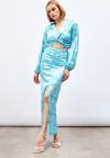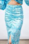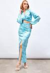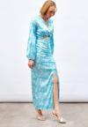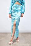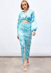 Yüksek bel, arka fermuarlı, yarım astarlı, yırtmaç detaylı, ön büzgülü desenli uzun etek.