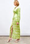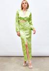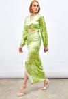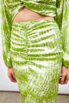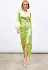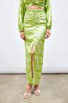 Yüksek bel, arka fermuarlı, yarım astarlı, yırtmaç detaylı, ön büzgülü desenli uzun etek.