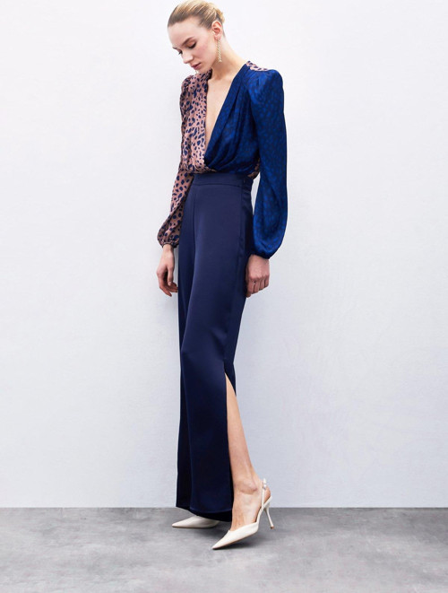 Yüksek bel, yandan fermuarlı kapama, yırtmaç detaylı saten pantolon.