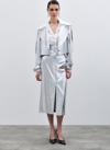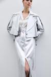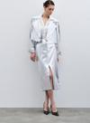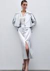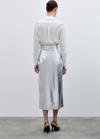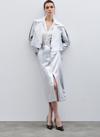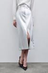 Ön bel fermuarlı ve kancalı kapama, yüksek bel, süs cepli, yırtmaçlı parlak kalem etek.