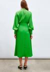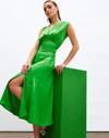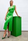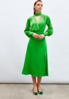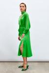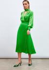 Yüksek bel, arka fermuarlı, midi boy, astarsız, yırtmaçlı saten etek.