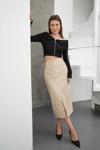 Bej rengiyle her renk ile kolayca kombinlenebilen bu eteği, özel davetlerden günlük hayata kadar birçok farklı ortamda tercih edebilirsiniz.