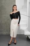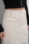 Yırtmaçlı uzun deri etek krem rengiyle gardırobunuza şıklık katacak bir parçadır.