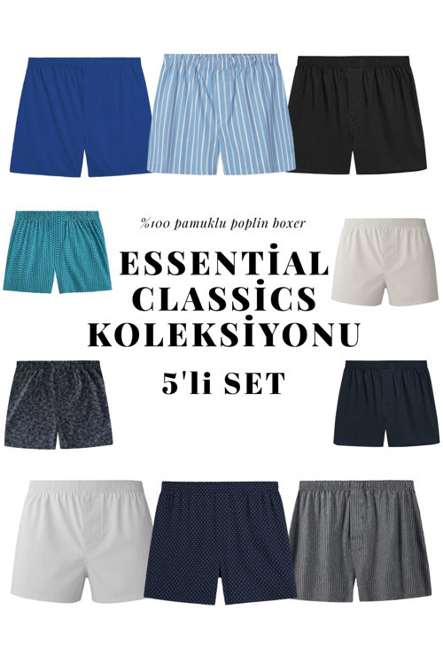 Yohannes Club Boxer Erkek, 5'li "Essentian Classics Koleksiyonu" % 100 Pamuklu Poplin Kumaş, Koyu Renkler, 5 Adet
