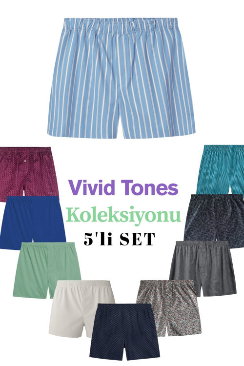 Yohannes Club Boxer Erkek, 5'li "Vivid Tones Koleksiyonu" % 100 Pamuklu Poplin Kumaş, Canlı Renkler, 5 Adet