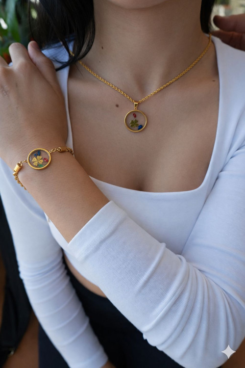Yonca Figürlü Gold Kaplama Kolye & Bileklik Seti – Şans ve Zarafeti Bir Arada