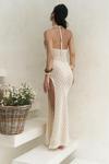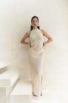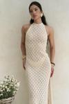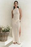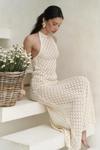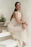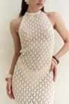 Boyundan bağlamalı, uzun triko elbise. Baklava desenli transparan detaylı. Astarsız.