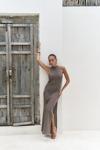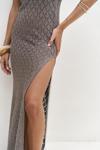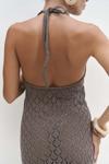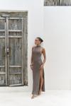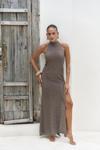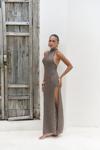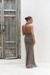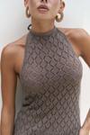 Boyundan bağlamalı, uzun triko elbise. Baklava desenli transparan detaylı. Astarsız.