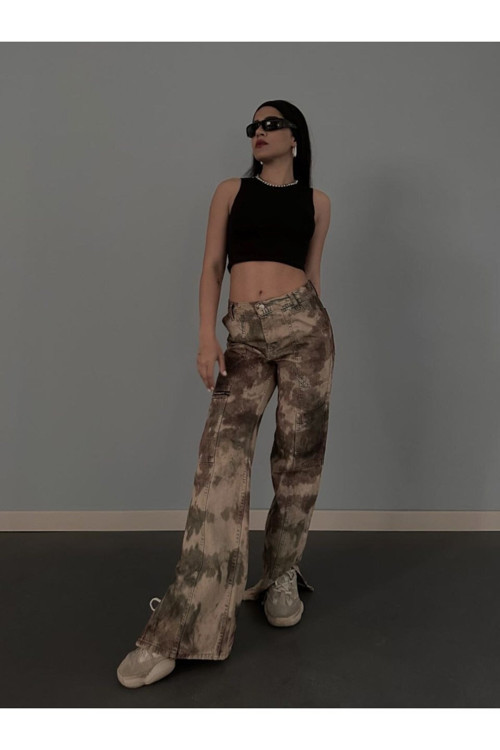 Yüksek Bel Batik Desenli Geniş Paça Jean