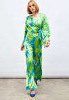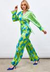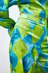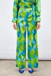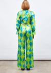 Yüksek bel, yan fermuarlı, geniş paça, desenli pantolon.