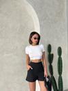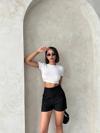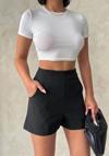 Yüksek bel parçalı double kumaş şort, hem şık hem de rahat bir seçenektir.