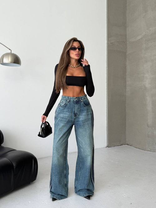 Yüksek Bel Yandan Dikiş Detaylı Geniş Paça Jean