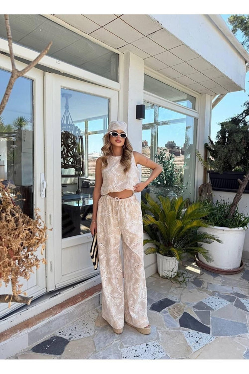 Bynkcl Yüksek kaliteli, desenli, özenle işlenmiş, lastikli bel ve geniş paçalı 2 parçalı bluz takımı.