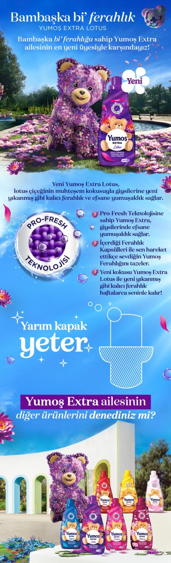 Bambaşka bi’ Ferahlık Yumoş Extra Lotus ile gelsin! Yumoş Extra’nın çok sevilen kokularına bir yenisi daha eklendi: Yepyeni Yumoş Extra Lotus! Yumoş Extra Lotus, lotus çiçeğinin muhteşem kokusuyla giysilerine yeni yıkanmış gibi kalıcı ferahlık ve efsane yumuşaklık sağlar. İçeriğindeki Pro-Fresh teknolojisi ile, ferahlık kapsülleri sen hareket ettikçe Yumoş ferahlığını tazeler. Haftalarca kalıcı ferahlık ve efsane yumuşaklığın yeni kokusu Yumoş Extra Lotus ile yeni yıkanmış gibi kalıcı ferahlık hep seninle kalsın! Özel olarak Yumoş Koku Uzmanları tarafından geliştirilen ve ferahlık kapsülleri içeren parfümü ile sen hareket ettikçe lotus kokusunu yeniler ve uzun süre ferahlık sunar. Yumoş Renk Uzmanlarının Yumoş Extra Lotus için geliştirdiği özel formülü ile, renklerin daha uzun süre yeni gibi capcanlı kalmasını sağlar. Renklerini hiç kaybetmeden uzun yıllar giymek istediğiniz kıyafetleriniz Yumoş Extra Lotus ile artık hep sizinle. Yumoş Kumaş Uzmanları ile birlikte geliştirilen doku koruma özelliği sayesinde giysilerinizi oluşturan lifleri sararak, giyme ve yıkama sırasındaki yıpranmayı engeller. Bu sayede efsane yumuşaklık, hızlı kuruma ve kolay ütüleme sağlar. Haftalarca kalıcı ferahlık ve efsane yumuşaklığın yeni kokusu Yumoş Extra Lotus ile yeni yıkanmış gibi kalıcı ferahlık hep seninle kalsın! Yumoş Extra Lotus’un bambaşka kalıcı ferahlığı, ile benzersiz bir parfüm deneyimi yaşamaya hazır olun! İçindekiler : %5-15 Katyonif Aktif Madde Benzisothiazolinone, Parfüm Alpha, Isomethyl lonone, Benzyl, Salicylate Hexyl Cinnamal Linanool Geranyl Acetate, Neden idefix?
