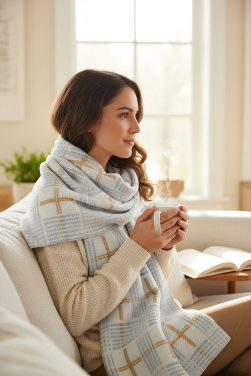 Aquaberry Yumuşak Ekoseli Premium Kışlık Atkı - Mavi