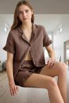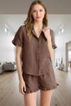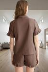 Kendinizi evinizin rahatlığında şımartın! %100 pamuk müslin kumaştan üretilen bu pijama takımı, yumuşak dokusu ve nefes alabilir yapısıyla gün boyu konfor sunar. Acı kahverengi rengi ile şık ve modern bir görünüm kazandırırken, fırfırlı detaylarıyla feminen bir hava katıyor. Kısa kollu gömlek ve boru paça şorttan oluşan bu takım, hem rahatlığı hem de stili bir arada sunuyor. Regular kalıbıyla her vücut tipine uyum sağlar ve günlük kullanım için idealdir.