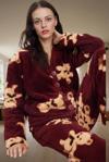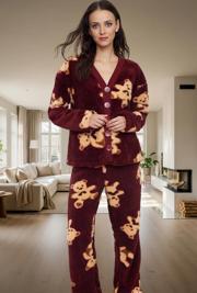 Kendinizi evinizin rahatlığında şımartın! Yumuşacık Wellsoft kumaştan üretilen bu bordo renkli pijama takımı, sevimli ayıcıklı deseniyle kış gecelerine renk katacak. Hem şık hem de son derece konforlu bu takım, gün boyu süren rahatlık sunar. Özellikle soğuk kış günlerinde sıcak ve güvenli bir hissetmenizi sağlayacak bu pijama takımı, kaliteli malzemesi ve özenli tasarımıyla öne çıkıyor.