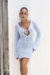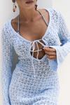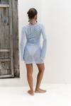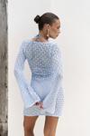Uzun evaze kol, göğüs bağlama detaylı, mini triko elbise. Astarsız.