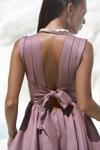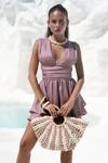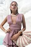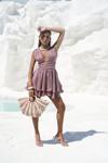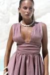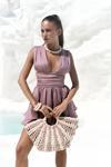 Derin V yakalı, kalın askılı elbise. Bel kısmı büzgü detaylı.Etek kısmı kloş formda ve mini boydadır. Arka fermuar kapamalı.