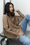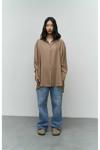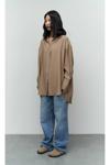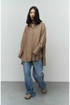 Oversize Kalıp, yakalı ve manşetli uzun kollu, önü düüğmeli, arkası robalı, etek ucu yuvarlak, arkası biraz daha uzun gömlek.