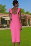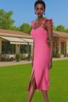 Yüksek kaliteli %88 polyester ve %12 elastan karışımından oluşan Finike dokuma kumaşı, nefes alabilir yapısıyla gün boyu rahatlık sağlar. Vücudu saran kesimi, vücut hatlarınızı zarifçe sergilerken, midi boyu her ortama uygun bir şıklık sunar. Standart kol tasarımı ve fırfırlı omuz detaylarıyla hem rahat hem de şık görünmenizi sağlayacak olan bu elbise, özel günlerinizi unutulmaz kılacak.