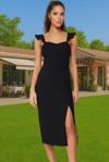 Yüksek kaliteli %88 polyester ve %12 elastan karışımından oluşan Finike dokuma kumaşı, nefes alabilir yapısıyla gün boyu rahatlık sağlar. Vücudu saran kesimi, vücut hatlarınızı zarifçe sergilerken, midi boyu her ortama uygun bir şıklık sunar. Standart kol tasarımı ve fırfırlı omuz detaylarıyla hem rahat hem de şık görünmenizi sağlayacak olan bu elbise, özel günlerinizi unutulmaz kılacak.