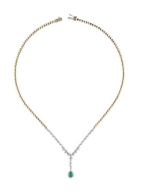 Sarı renk 14 ayar altın ile ürettiğimiz; Zarif Pırlanta Zümrüt Gerdanlık tamamen parlaktır. Pırlantalar minik gruplar halinde damla kolye ucuna doğru ilerliyor. Her kadının kıyafetleri ile rahatlıkla kombinleyeceği çok kullanışlı klasik bir gerdanlık modeline kibar bir dokunuş.