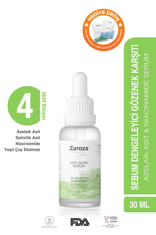 Zaroza Siyah Nokta ve Karşıtı Antı-Acne Serum, güçlü formülü ile gözenek, siyah nokta, yağlanma gözlenen hassas ciltlerde, oluşumunu engellemeye, ciltteki sebum dengesini korumaya, cilt tonunu dengelemeye yardımcı olur.