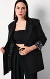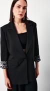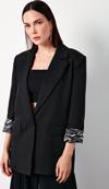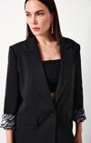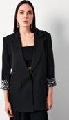 Kruvaze yaka, ön tek düğmeli, kapaklı süs cep, vatkalı, uzun geniş kol, zebra astarlı uzun ceket.