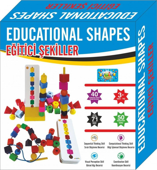 Zekice Eğitici Şekiller Akıl Oyunu; Eğitici şekiller akıl oyunu7 farklı renkte 40 adet geometrik şekil, 50 adet soru kartı, geometrik şekilleri sıralamak için ahşap çubuk ve ahşap uçlu özel iplik.; Eğitici şekiller ne işe yarar: Çocukların motor becerileri gelişimine faydalıdır.; Örüntü kavramını öğrenmelerine ve uzamsal algılarını geliştirmeye yardımcı olur.; Farklı renk ve şekilleri dizmek için gösterdiği çaba görsel algısını geliştirebilir.; Düşünme becerilerinin gelişiminde etkilidir.; Eğitici şekiller nasıl oynanır: Bir veya iki kişi ile oynanabilen eğitici şekiller, verilen soru kartının doğru bir şekilde ahşap çubuklara veya ipe dizilmesi ile oynanır.; Oyun iki kişi ile oynanıyorsa soru kartını ahşap çubuğa doğru şekilde dizen ilk oyuncu kazanır.; Oyun, kullanıcının istediği şekilde farklı yöntemler kullanılarak da oynanabilir.; Örneğin oyuncunun rastgele dağıtılmış geometrik şekillerden isteneni bulup ahşap çubuğa dizmesi istenebilir.; Bunu yaparken geometrik şeklin ismini veya rengini söyleyerek çocuğun renk ve şekil kavramı pekiştirilir.; Soru kartlarında renksiz olarak gösterilen şekiller farklı renk olsa da gösterilen geometrik şeklin bulunup ahşap çubuğa dizilmesi içindir.; Barkod : 8682214590496; Yaş : 3 ve üzeri; Tüm kredi kartlarına taksit ve aynı gün kargo avantajları ile satın alabilirsiniz. ;