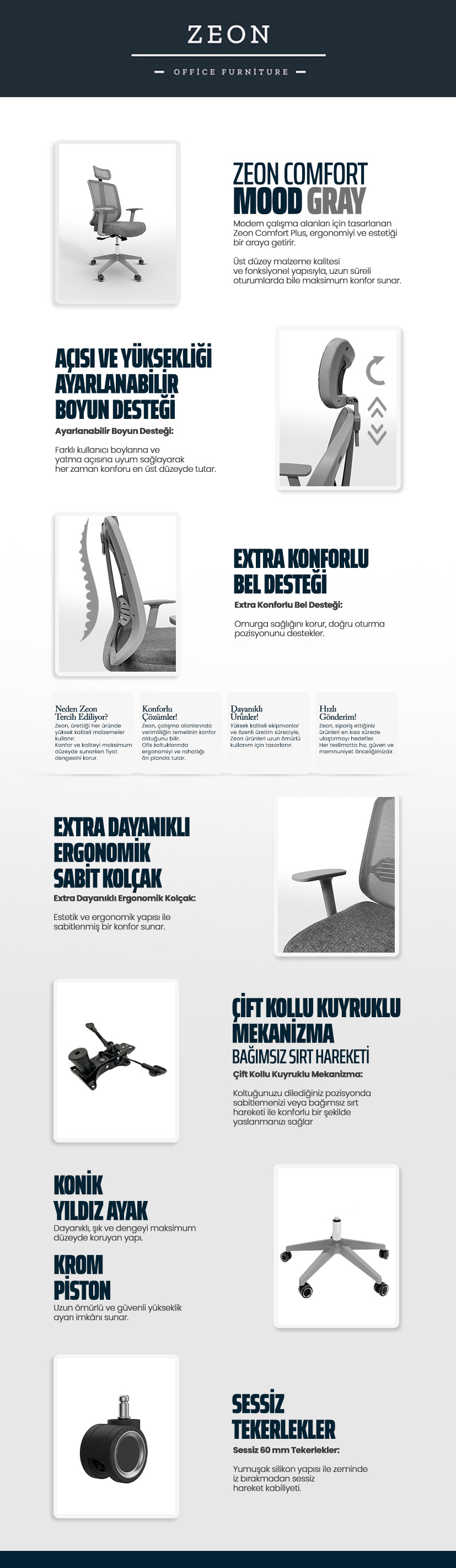 -Vücudu destekleyen ergonomik yapısı, uzun saatler boyunca dengeli ve rahat bir oturum sunarken; ayarlanabilir detayları kişisel konforunuzu en üst seviyeye taşır.
